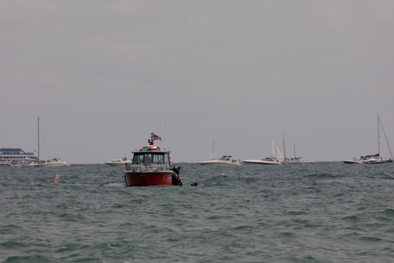 The Chicago Fire Department Helicopter and Boat demonstrated a water rescue by dropping a dummy into the water followed by 2 divers. The divers “rescued” the dummy by bringing it to the boat where it was pulled on board.