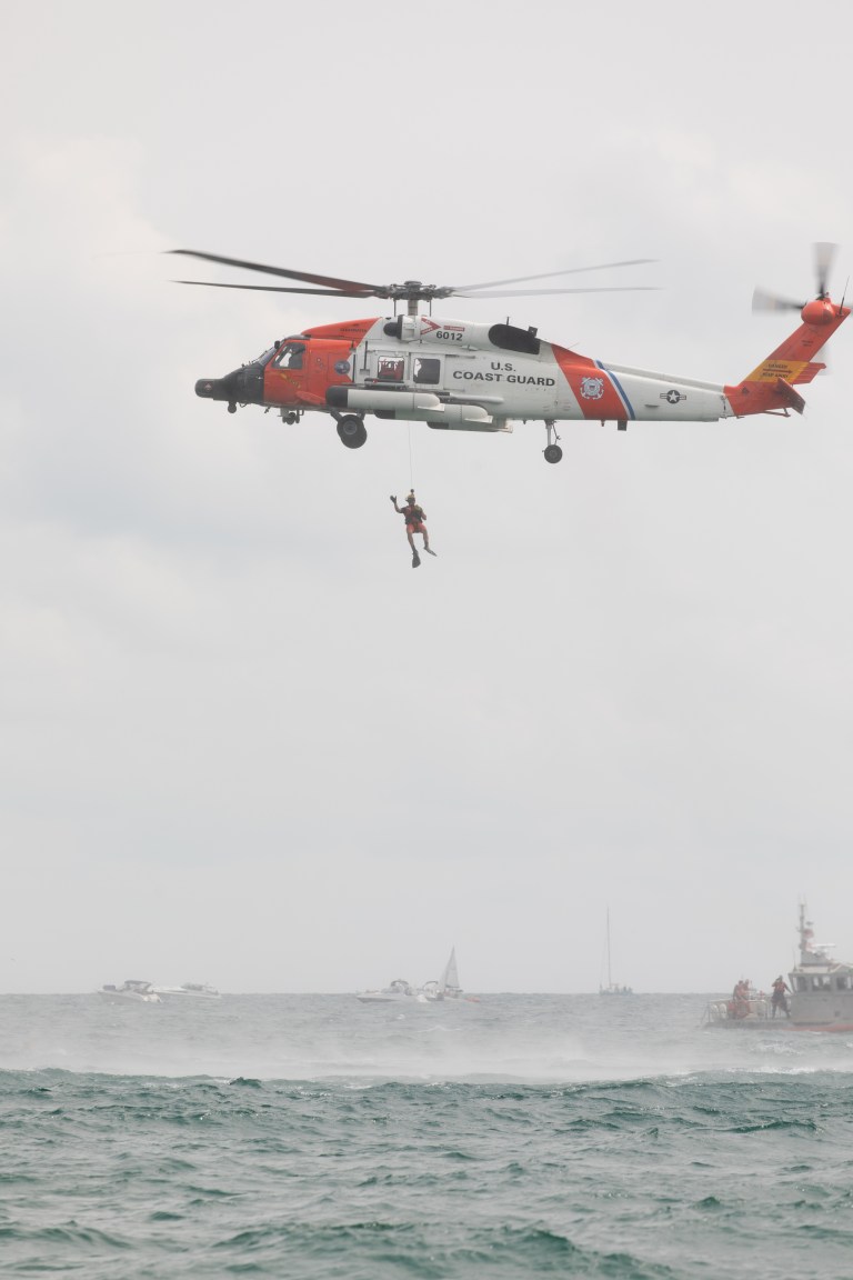 The US Coast Guard demonstrated an advanced water rescue by lowering a diver from their MH-60 helicopter. They then lowered a basket down to a boat below. After raising the basket, they brought the diver back up to the helicopter. I think the demonstration was to simulate the ability to transfer rescued persons back up to the helicopter for quick transport.