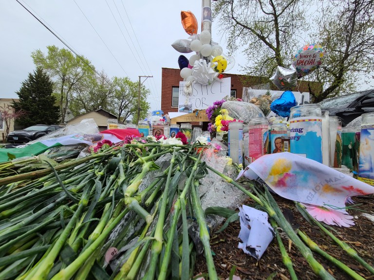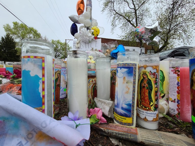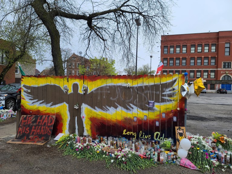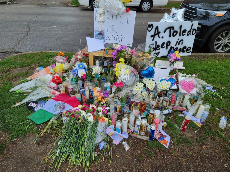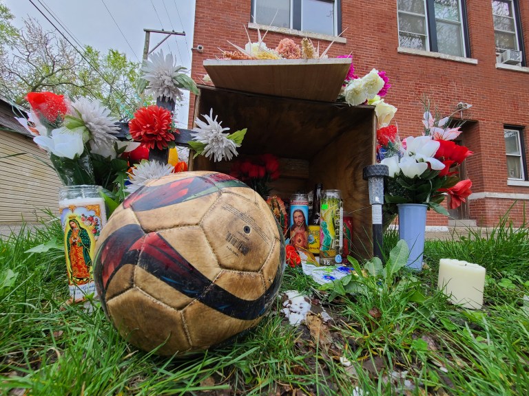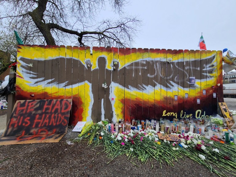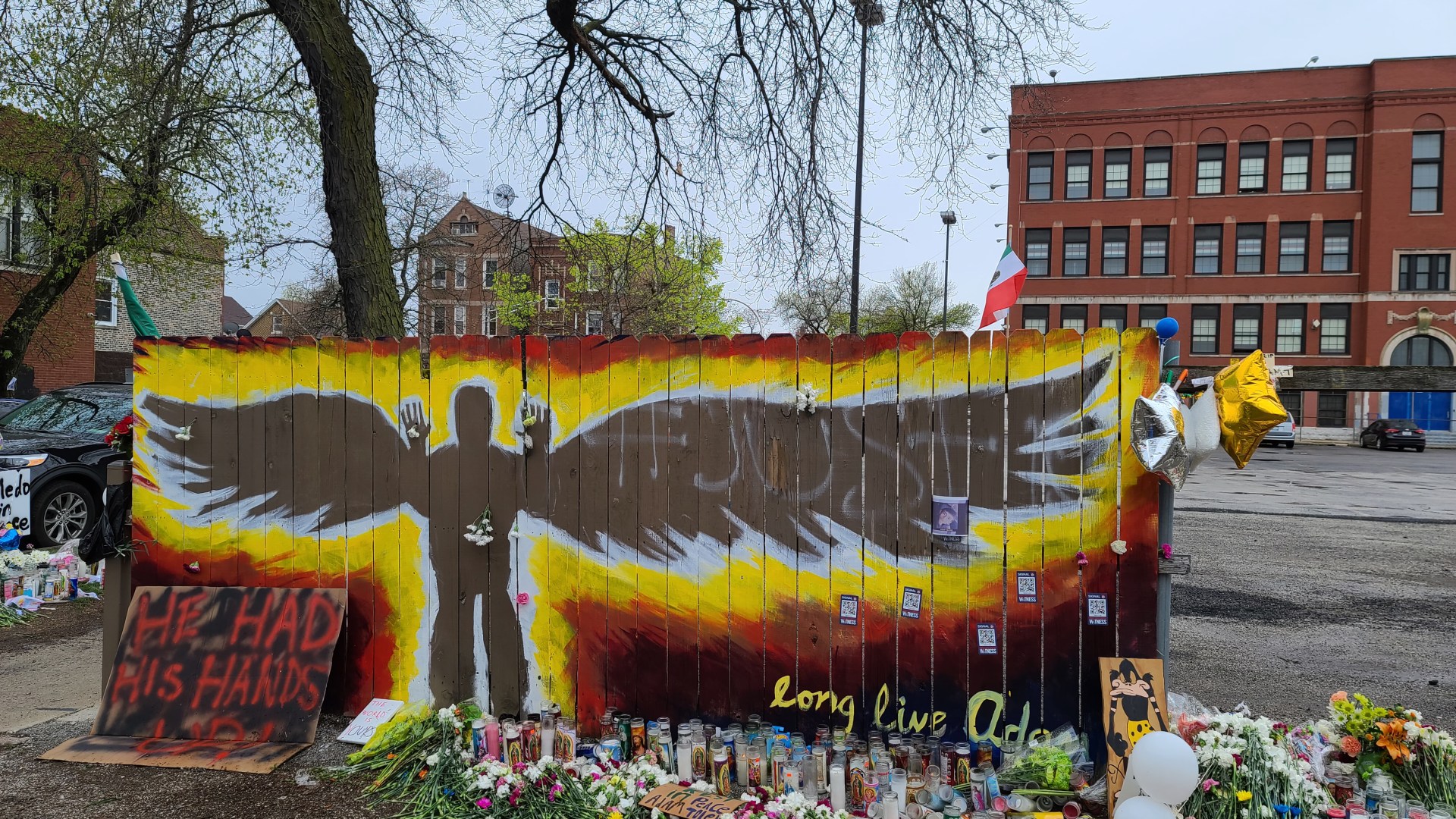 On Monday, April 19th I visited the Memorial for Adam that was created at the location where he died, in the alley behind 24th St. and Sawyer Ave. There is a beautiful mural there depicting Adam with angel wings and his hands raised in surrender. The mural was surrounded by a massive amount of flowers and candles for Adam. There were also several sports balls including the soccer ball below, which were placed in tribute to him.